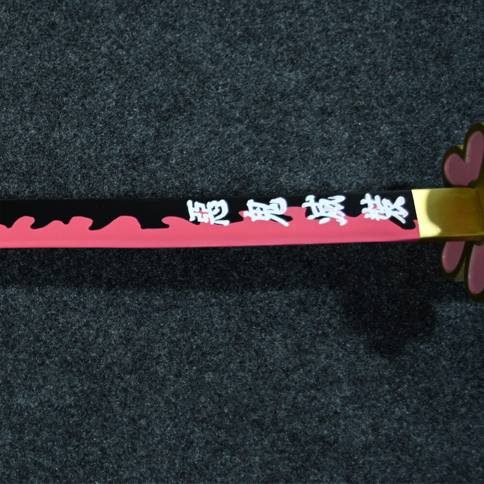 The Mitsuri Kanroji Nichirin Wood Replica stands out with its unique blend of gentleness and strength. Featuring a vibrant pink blade with gold accents and a distinctive Tsuba (handguard) shaped like four interlocking hearts, it serves as an unrivaled “Aesthetic” decor piece.