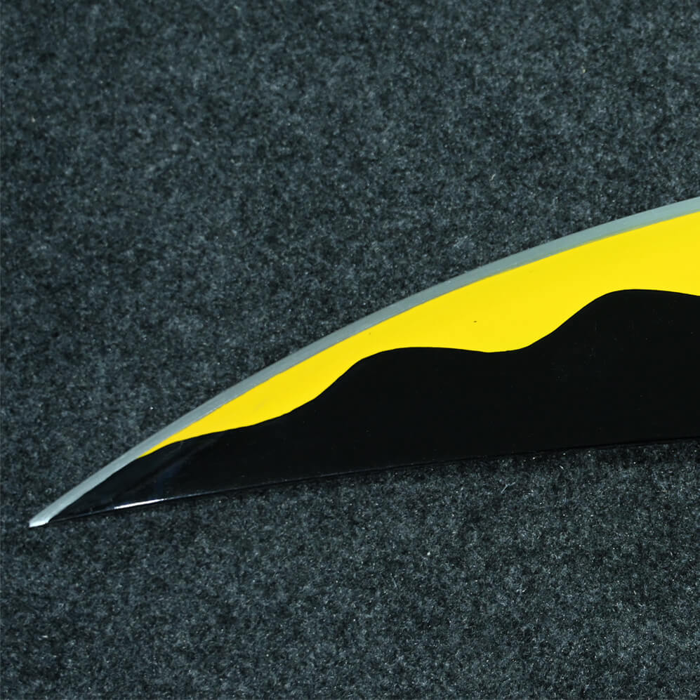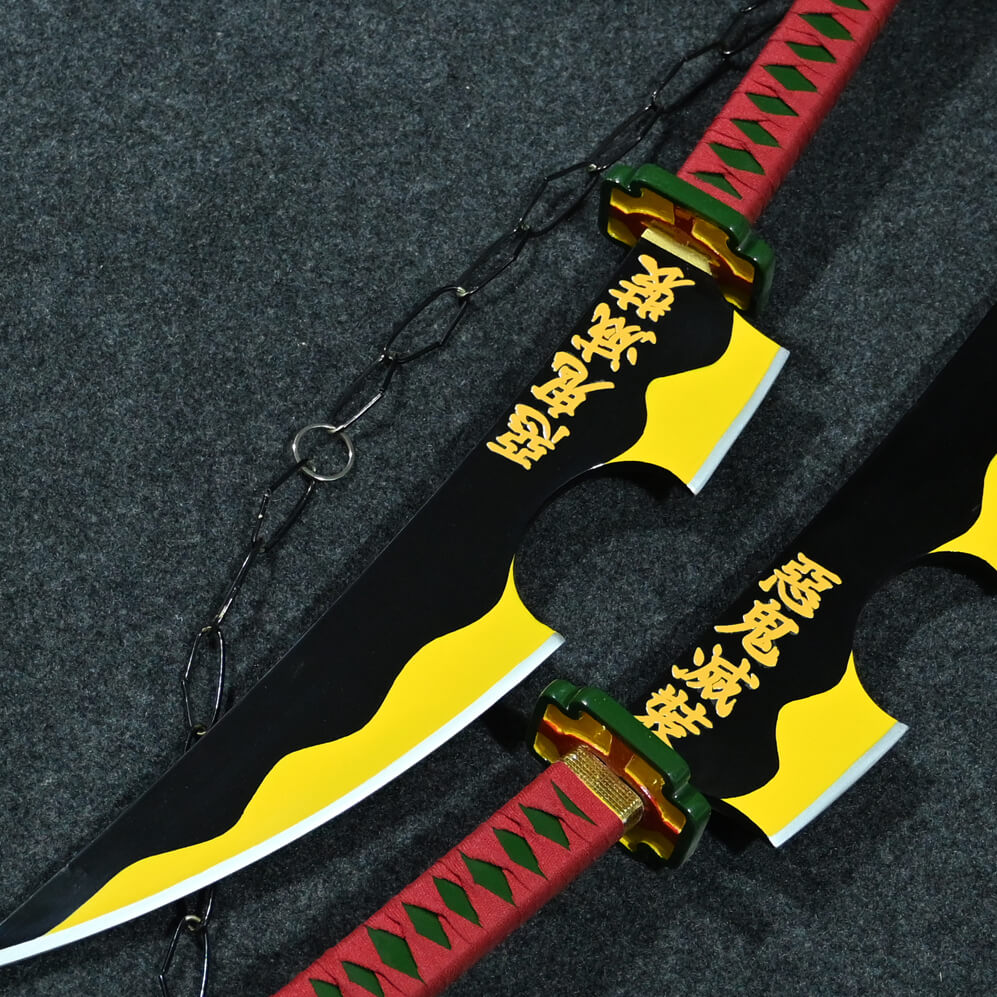 This specific Tengen Uzui Nichirin Wood Replica is renowned for its unique dual-blade silhouette. Featuring a striking black and amber-gold palette with signature circular cut-outs, the set is connected by a durable chain to provide an authentic shinobi experience.